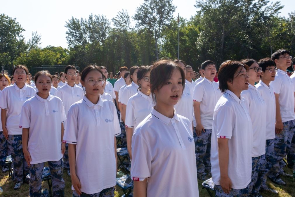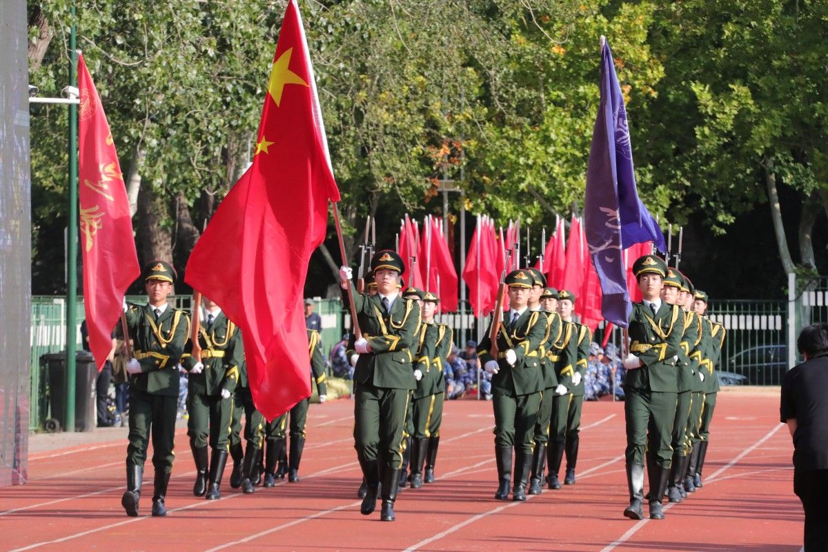 在激昂雄壮的国歌声中,鲜艳的五星红旗冉冉升起,全场师生齐唱国歌。