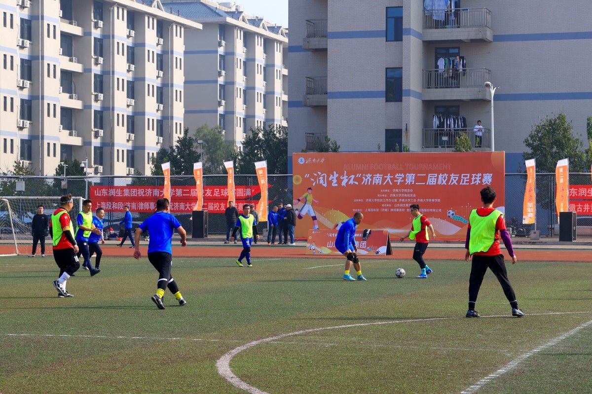 11月1日,济南大学“润生杯”第二届校友足球赛在学校南苑操场举办。来自地方校友会、学院校友分会、在校师生组成的8支队伍同场竞技。济南大学党委常委、副校长黄加栋,党委常委、统战部部长徐庆国出席活动并致辞。学校党委保卫部、合作发展处、体育学院等相关负责人,参赛队员、校友代表和在校师生共200余人参加活动。