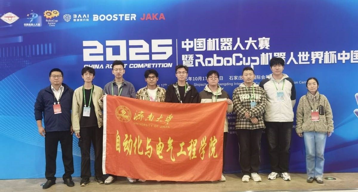 10月19日,由中国自动化学会主办的2025中国机器人大赛暨RoboCup机器人世界杯中国赛在石家庄落下帷幕,济南大学自动化与电气工程学院本次报名参加了其中的三个赛项,分别是由李猛老师指导,宋奇迅、陈天宇等同学完成的“工程竞技类机器人——车型搬运赛”;由赵钦君老师指导,刘鑫阳、柏家烨等同学完成的“农业机器人——节水灌溉机器人”;由张勤老师指导,杨天宇、冯长瑞等同学完成的“四足仿生机器人——快递运输赛小型组”。凭借创新的方案设计、完善的程序架构以及出色的稳定性,三支队伍均取得了国家一等奖的好成绩。