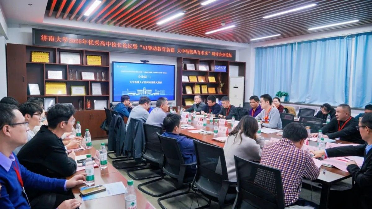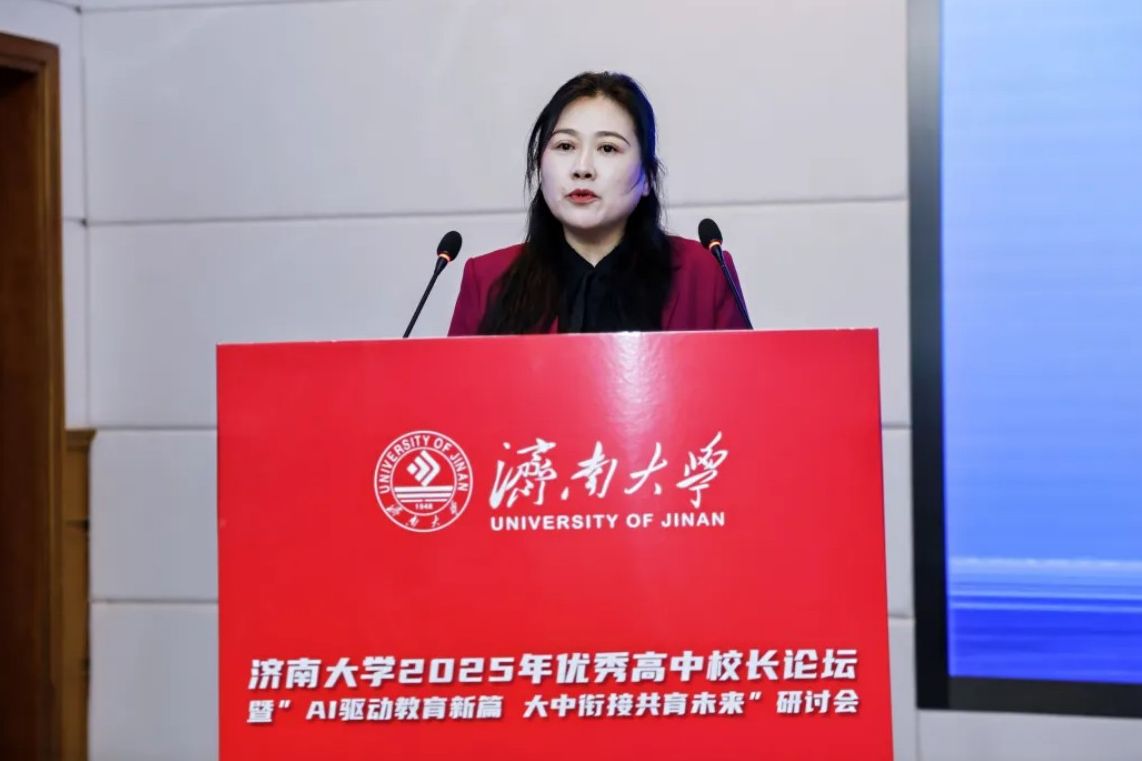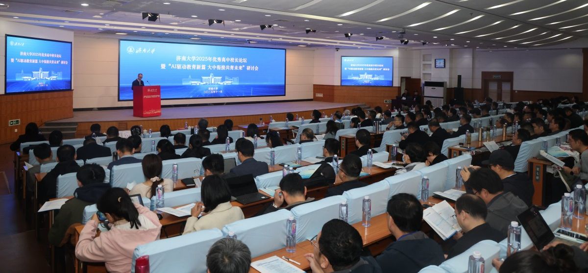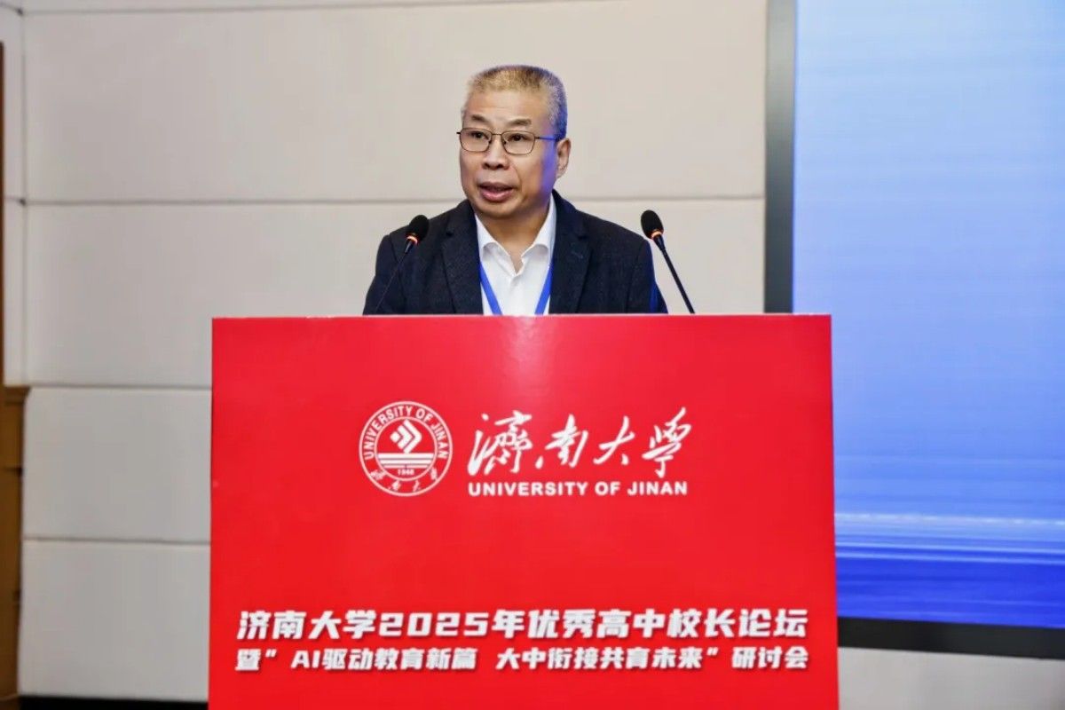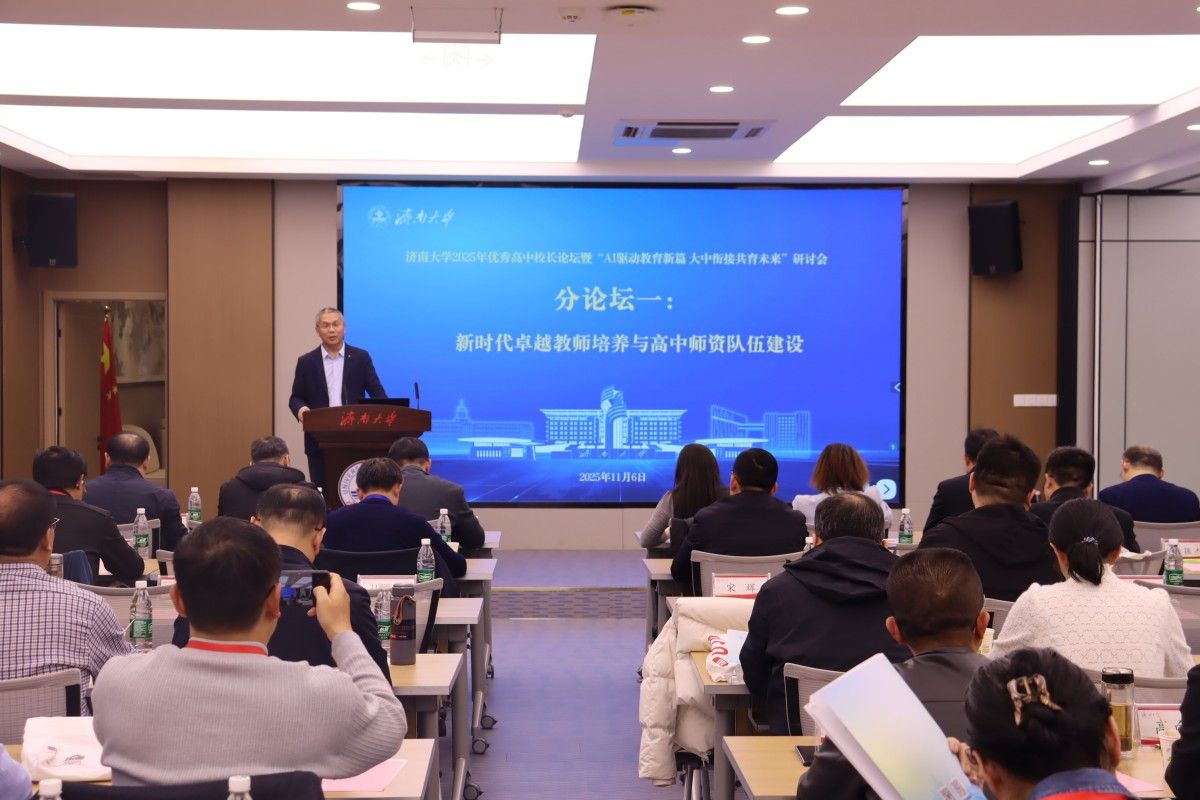 11月6日-7日,济南大学举办2025年优秀高中校长论坛暨“AI驱动教育新篇 大中衔接共育未来”研讨会。本次论坛紧扣国家教育数字化战略行动要求,重点探讨人工智能时代教育变革与创新路径,为推动高质量教育体系建设、服务教育强国目标贡献智慧力量。来自教育主管部门领导、教育界专家、57所优秀高中校领导和教务主任、各学院领导班子、教师代表和教育硕士研究生代表近300人参加论坛。济南大学副校长徐征和致欢迎辞,山东省教育招生考试院党委委员、副院长赵丽受邀致辞,会议由济南大学教务处处长、教学质量与评估办公室主任陈贞翔主持。