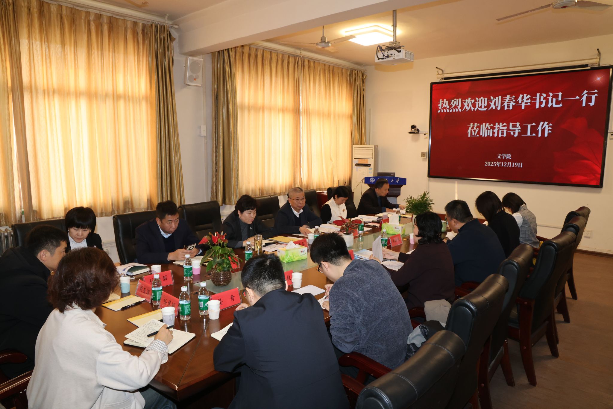 刘春华充分肯定了文学院近年来在科学研究、人才培养等方面取得的成效,并对学院高质量发展提出五点要求:一是要全面加强党的建设,深入学习贯彻党的二十届四中全会精神,规范议事决策机制,打造党建特色品牌,推动党建与业务融合,营造风清气正的育人环境。二是要打造过硬领导班子,班子成员带头团结协作、务实担当、廉洁高效,持续提升凝聚力与战斗力,形成推动发展的坚强核心。三是要深入推进学院事业高质量发展,落实“十五五”规划与教育科技人才工作会议精神,加强高水平师资队伍建设,提高人才培养质量,强化学科内涵建设,加快推进博士点建设。四是要严守安全稳定底线,深入学生、深入班级、深入宿舍,严格落实学校安全部署,加强特殊群体学生关心关爱工作,维护学生身心健康和校园安全稳定。五是要着力推进“十五五”规划编制。积极推进各项任务落实,高质量起草编制学院“十五五”发展规划。