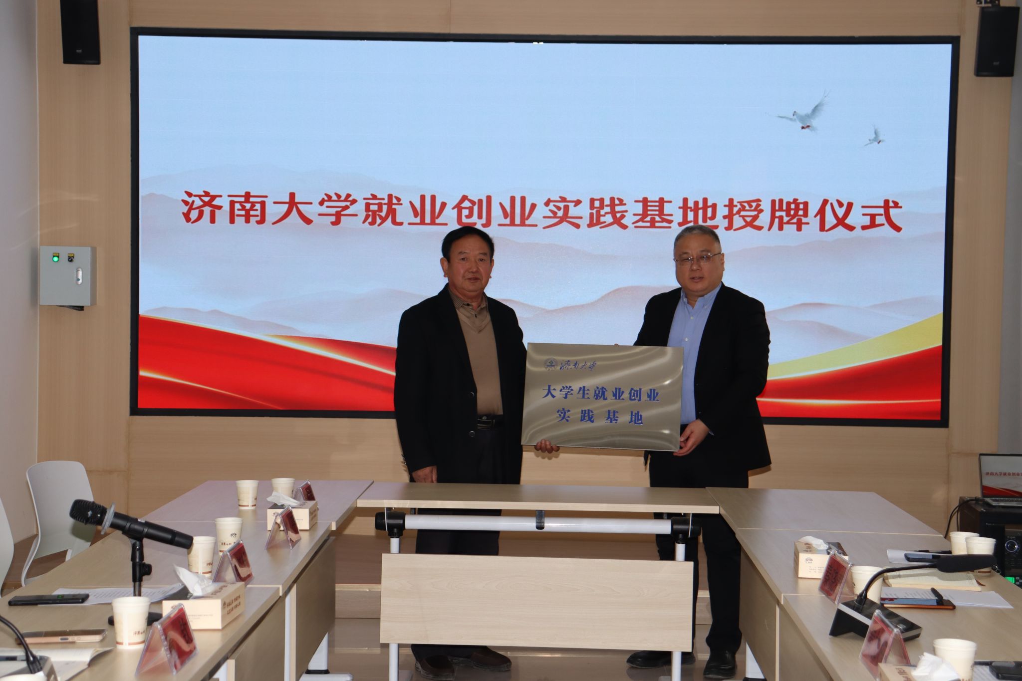 座谈会上,黄加栋与企业代表共同为“济南大学大学生就业创业实践基地”“济南大学就业实习基地”授牌。