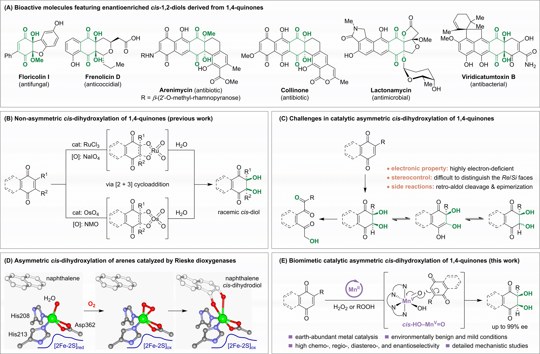 受自然界Rieske双加氧酶的启发(图1D),研究团队设计了一种仿生非血红素锰配合物催化剂,以绿色环保的双氧水(H2O2)或烷基过氧化氢为氧化剂,成功实现了醌类化合物的不对称顺式双羟化反应(图1E)。该体系在温和条件下表现出优异的化学选择性、区域选择性和对映选择性(高达99% ee),且完全非对映选择性控制。值得一提的是,这是首次将烷基过氧化氢用作顺式双羟化反应的氧化剂,拓展了氧化剂的选择范围。