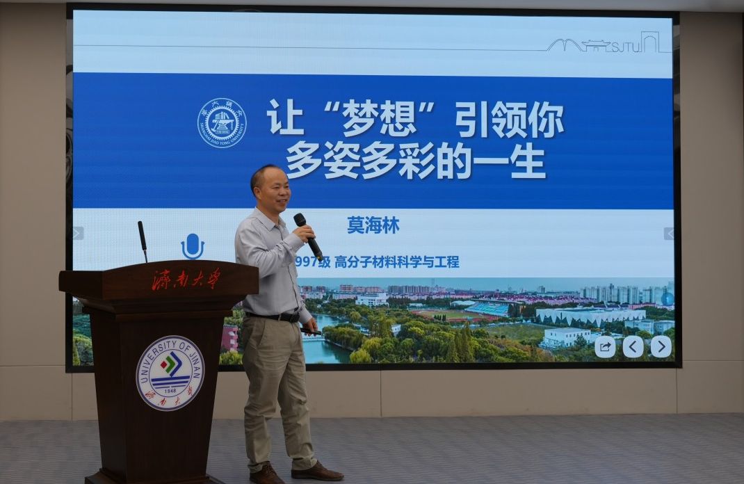 校友生涯讲堂上,莫海林以《让“梦想”引领你多姿多彩的一生》为题讲述了自身从山区求学成长为行业精英的经历,从求学、工作、创业三方面,分享了在济大时光、知名企业任职及自主创业的奋斗历程。最后他勉励同学们坚定理想、终身学习,实现个人与社会价值统一。