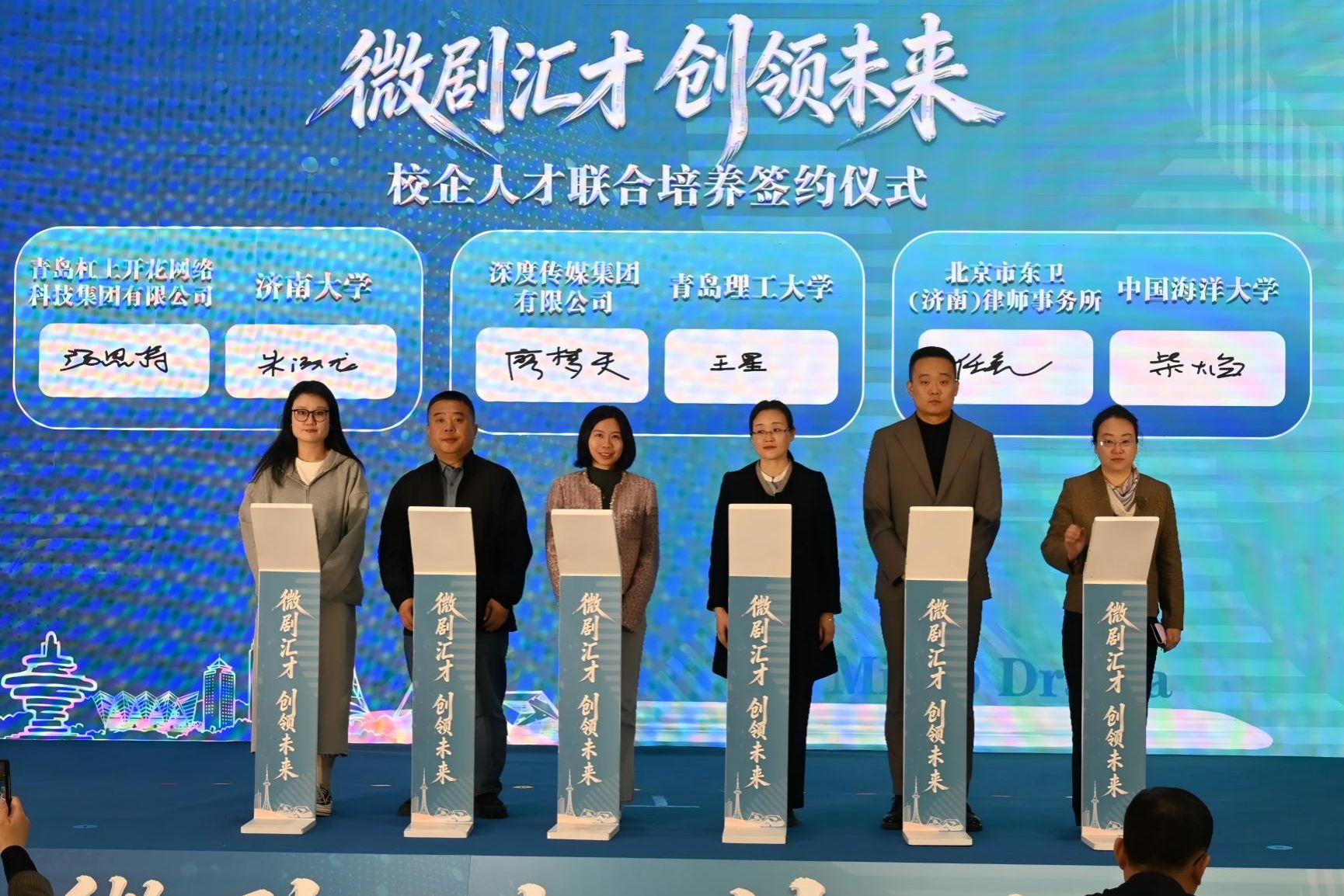 朱海龙代表学院与青岛杠上开花网络科技集团有限公司签订校企人才联合培养框架协议。文学院王文煜作品《我的赛博妈妈》、薛晓丹作品《食香千年》荣获二等奖;韩钰作品《百花村求生指南》荣获三等奖;孙靖雯作品《穿越御膳房三个月,我用AI让千年非遗重回巅峰》荣获优秀奖。获奖作品紧扣时代脉搏,融合现实关怀与创新表达,体现了青年学子扎实的文学素养和敏锐的创作视角,充分展现了学院在文学创作与人才培养方面的扎实基础与创新活力。