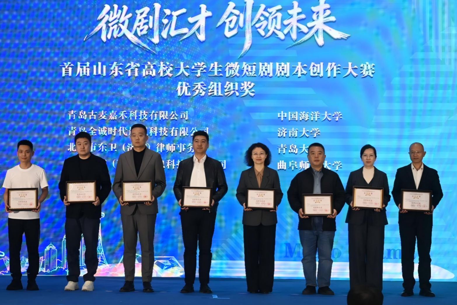 3月27日,“微剧汇才 创领未来”首届山东省高校大学生微短剧剧本创作大赛颁奖仪式在青岛举行,济南大学荣获优秀组织奖,文学院学生获得二等奖2项、三等奖1项、优秀奖1项。学校党委常委、宣传部部长卢旺带队赴青岛参加颁奖仪式,文学院党委书记朱海龙,文学院党委副书记、副院长潘颖等一行参加活动。
