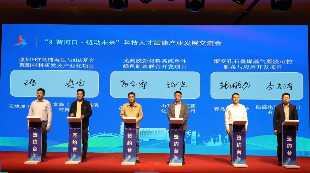 活动期间,济南大学化学化工学院副教授高令峰与山东汇海医药化工有限公司总经理王乐强代表双方签署《光刻胶新材料高纯单体绿色制造联合开发项目》,进一步推动学校科研优势与企业技术需求精准对接,助力河口区精细化工产业创新发展。