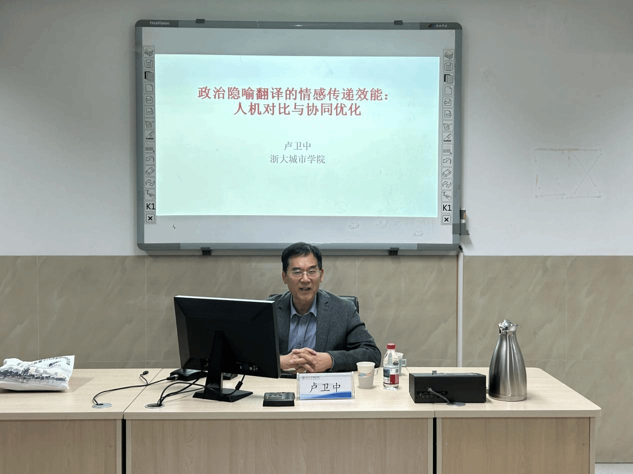 上海外国语大学博士、浙大城市学院外国语学院三级教授、曲师大翻译学院创始院长卢卫中以“政治隐喻翻译的情感传递效能:人机对比与协同优化”为题,向师生解码和对比了人工译者和大语言模型在政治文献隐喻翻译过程中各自的优势劣势,二者各有长短。同时,具体讲解了人机协作翻译政治隐喻的具体优化策略。