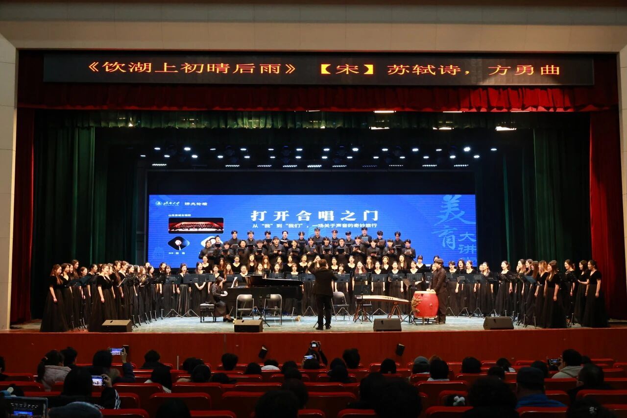12月17日,由济南大学美育学部、教务处、团委共同主办,音乐学院承办的“打开合唱之门——从我到我们,一场关于声音的奇妙旅行”美育大讲堂活动在济南大学大礼堂落幕。本次活动面向全校学生,以合唱艺术为载体,通过生动的讲解、丰富的作品导赏与沉浸式互动,深入浅出地展现了合唱艺术的独特魅力与美育内涵,吸引了近五百名师生参与,现场反响热烈。