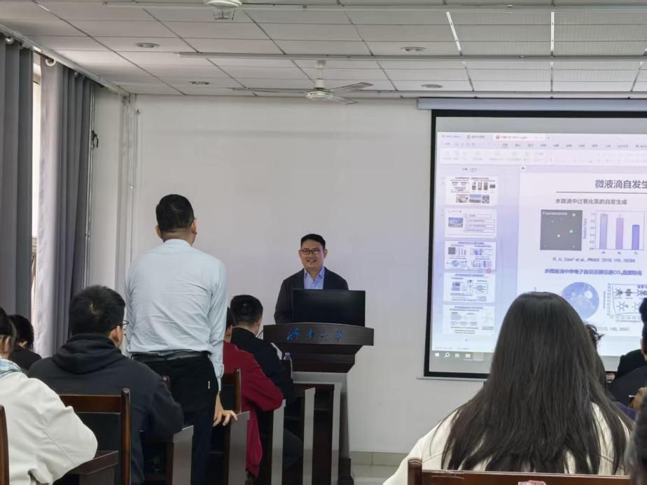 范凤茹教授作了题为“新型带电界面上的催化反应”的学术报告。他结合课题组近年来研究成果,针对带电界面体系电荷行为复杂、耦合机制不明确等挑战,重点介绍了在固/液接触起电、液/气微液滴及异质钯氢电催化三类典型界面上的系列研究进展。在固/液接触起电界面,基于机械作用诱导的界面电荷转移,实现了常温常压下过氧化氢的绿色合成与甲烷的选择性氧化;在液/气微液滴带电界面,利用其自发形成的强电场与独特微环境,发展了二氧化碳还原、氮气固定及多种自由基反应新途径;在异质钯氢电催化界面,通过调控Pd-H动态作用与界面储氢行为,揭示了晶格氢迁移与表界面反应之间的耦合机制。范凤茹教授系列工作阐明了不同带电界面上电荷行为与反应过程耦合的基本原理,为发展新型催化体系与绿色合成策略提供了新思路,并在小分子转化与能源化学中展现出应用潜力。