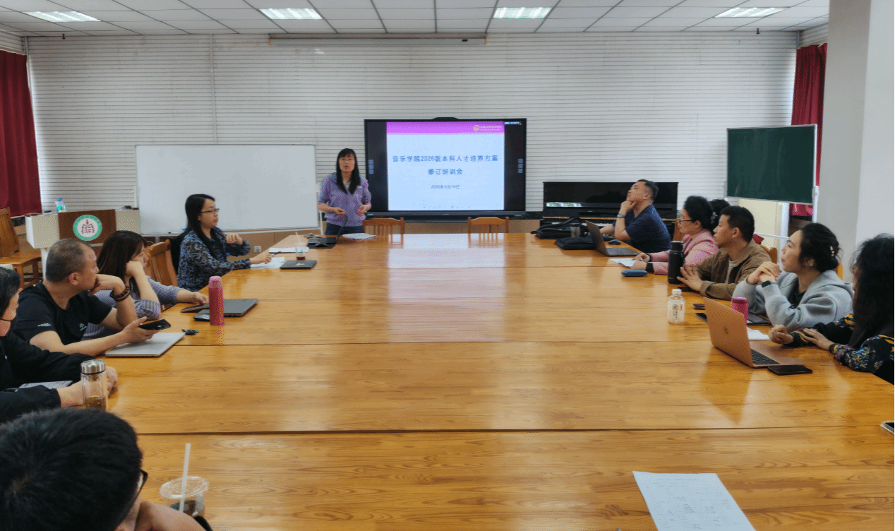 为科学谋划学院本科人才培养工作,全面提升育人质量,4月14日下午,音乐学院在研讨课教室召开2026版本科人才培养方案修订专题培训会。会议特邀湖南师范大学二级教授、本科教育教学评估专家、教育部师范专业认证专家谭长银线上作专题培训。学院领导、各系正副主任、音教系与舞蹈系全体教师及教学办成员参会。会议由学院副院长齐丽花主持。