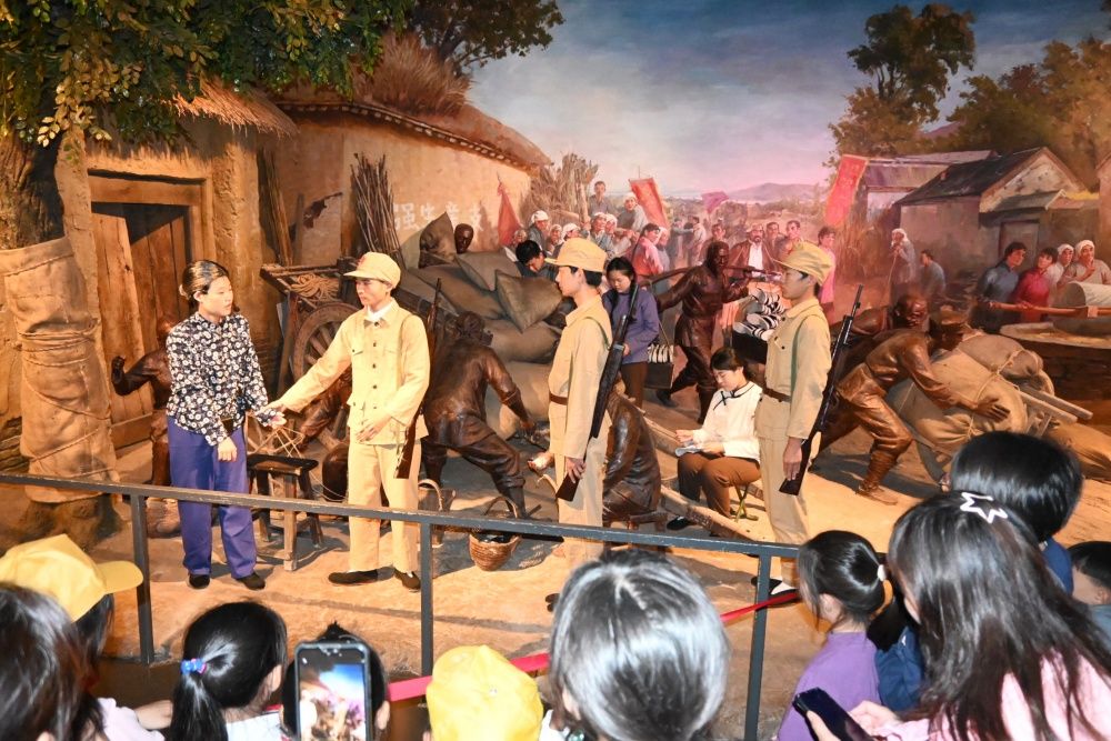 国庆节当天,文学院高芳荟、敖游、张森三位老师带领八位学生赴济南战役纪念馆进行演出。演出在馆中打造的实地场景“人民支前”农家小院进行,讲述了支前拥军模范李自兰带领村民支援前线、送儿子参军的故事,展现了山东解放区人民在党的领导下“男女老少齐动员,家家户户忙支前”的支前场景和革命精神。演员们穿上解放军军装、粗布短衣,拿起步枪、扛上麻袋,与背景融为一体,让红色故事“实地重现”,让爱国主义学习教育“活”起来。
