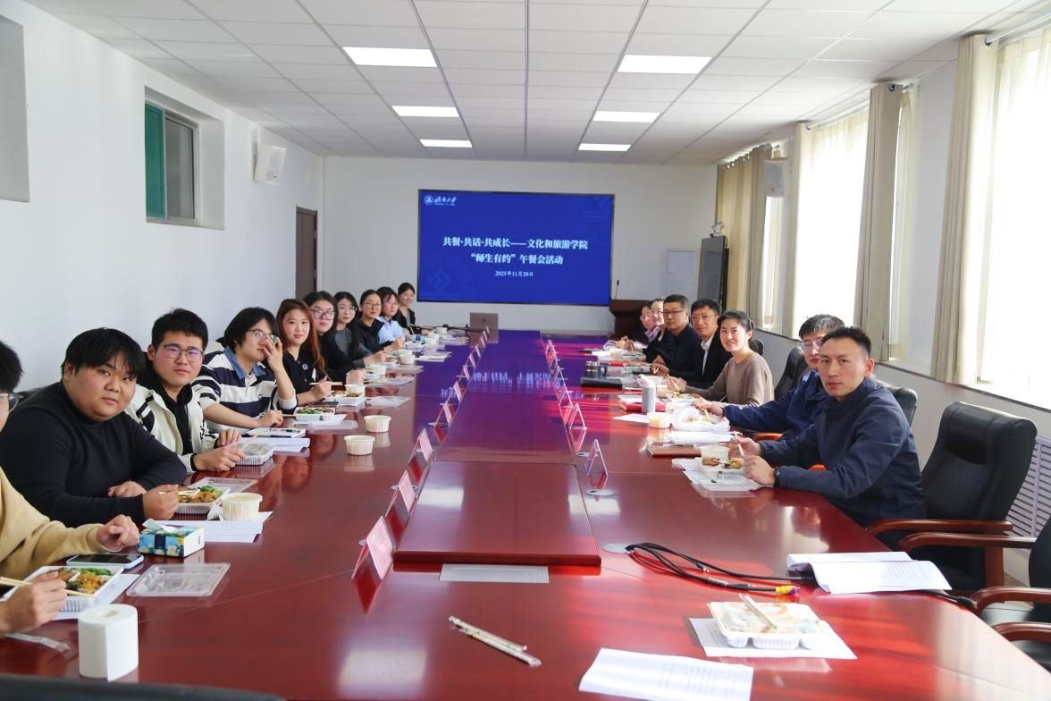为构建和谐融洽的师生关系,倾听同学们最真实的声音,11月20日中午,文化和旅游学院在学院212会议室举行共餐·共话·共成长——“师生有约”恳谈会活动。学院党委书记孟德洋,学院全体辅导员老师和各年级各专业学生代表参加,活动由学院党委副书记、副院长信苏珊主持。