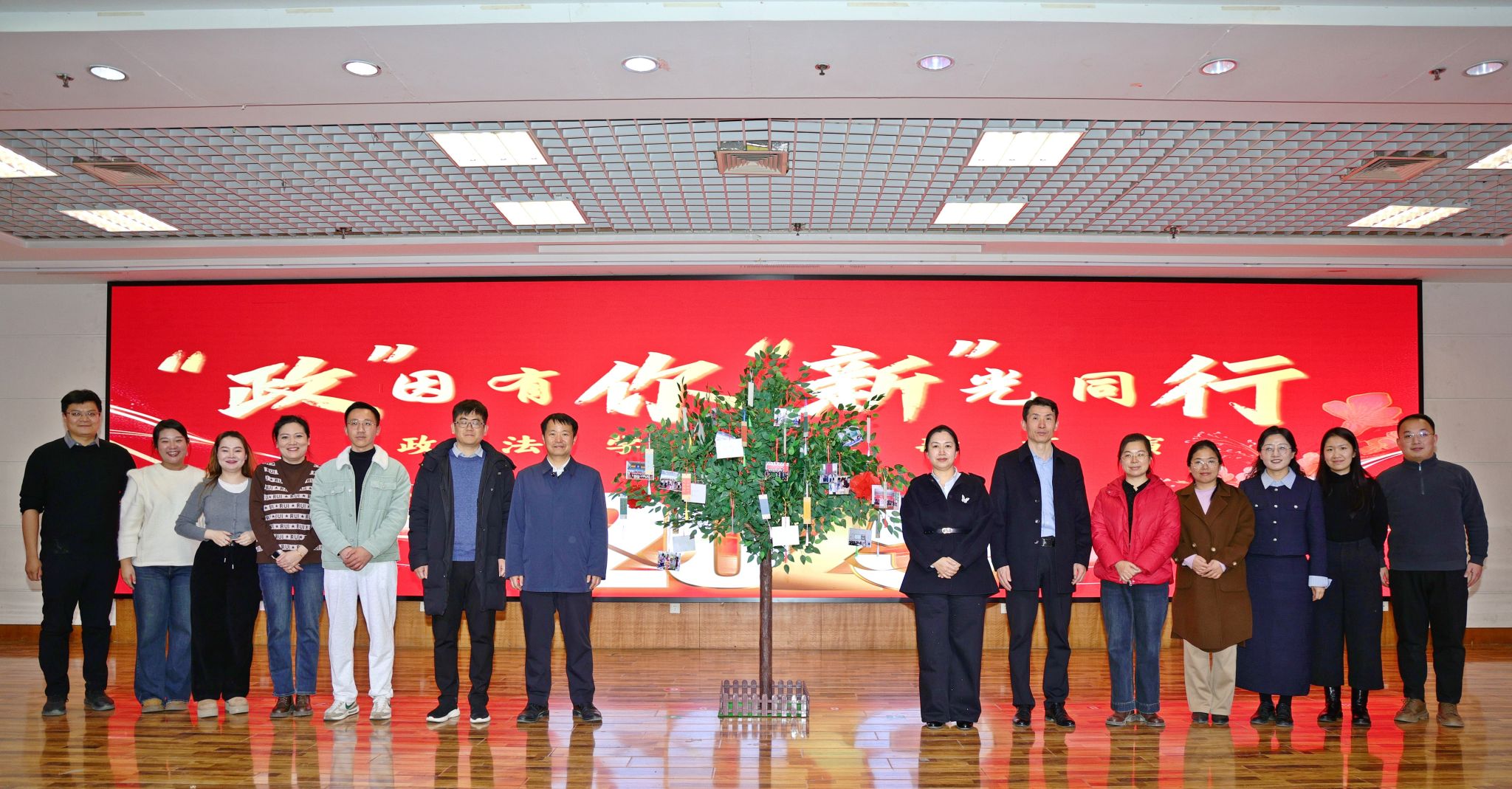 入场前,同学们选取政法学院一年来的活动照片,悬挂在许愿树上;活动中,与会领导、老师和同学们写下对学校、学院、自己、家人的美好祝愿,共同将许愿卡悬挂到许愿树上。