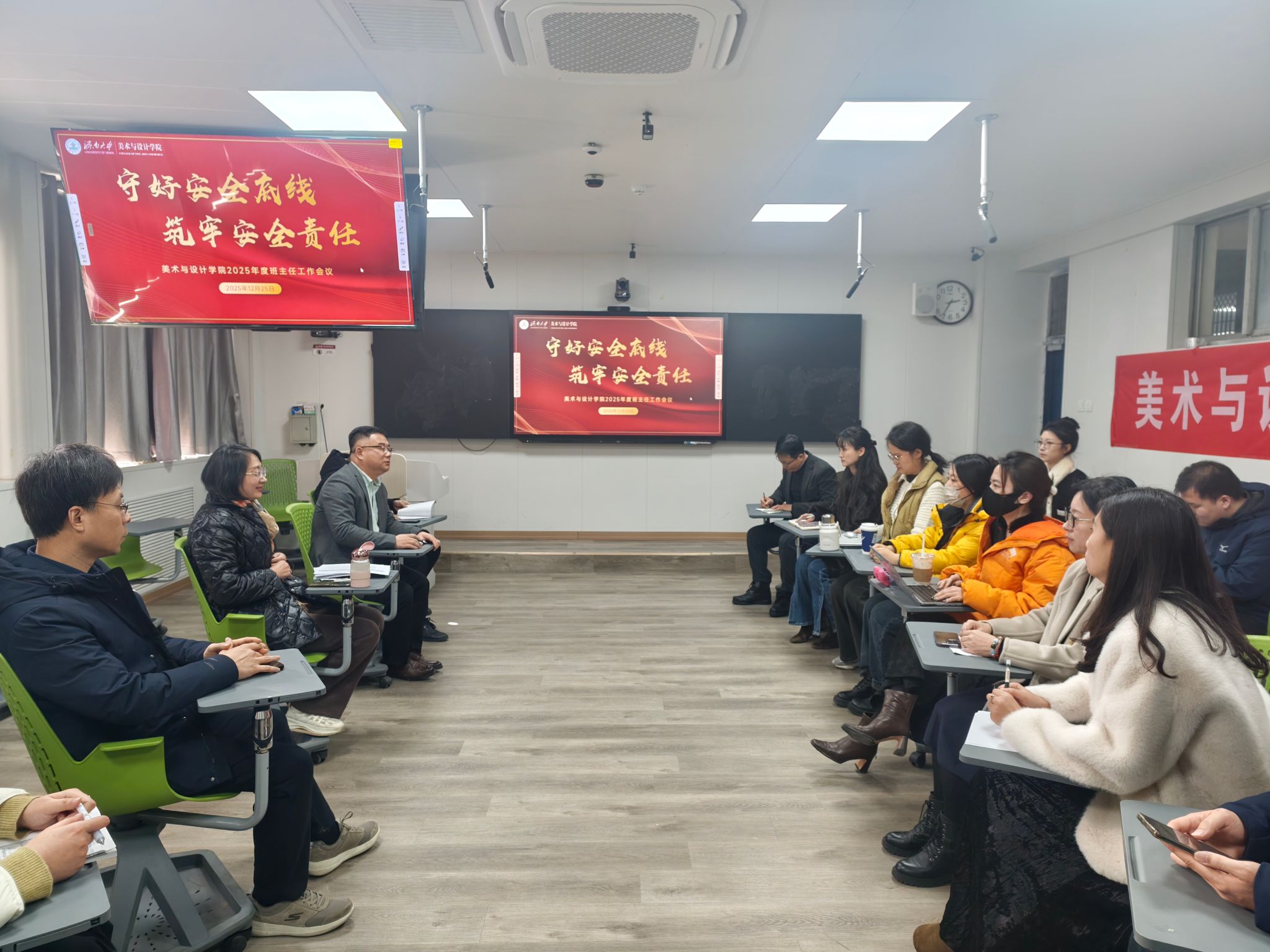 为进一步压紧压实班主任工作责任,全面提升学院班级治理水平和育人实效,12月25日下午,美术与设计学院在第4教学楼304教室召开“守牢安全底线 筑牢安全责任”2025年度班主任工作会议。学院领导班子成员参加会议。会议由学院党委副书记、副院长何贵亮主持。