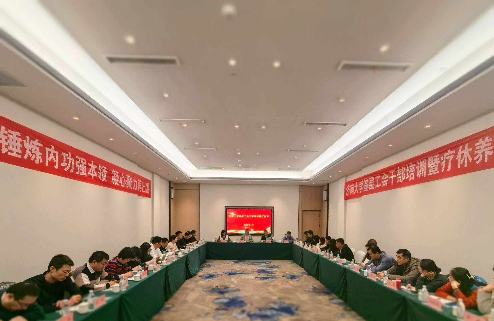 为深入学习贯彻中国工会十八大精神,切实加强我校基层工会干部队伍建设,提升基层工会干部的理论水平和履职能力,同时体现学校对基层工会干部的关怀,激发工作热情。1月7日至8日,校工会精心组织开展了基层工会干部专题培训暨疗休养活动。活动以“锤炼内功强本领 凝心聚力再出发”为主题,通过政策解读、业务指导、经验交流与身心休整相结合的方式,为基层工会干部“充电蓄能”,推动工会工作高质量发展。校工会主席边健出席开班仪式并作动员讲话,来自各基层工会的主席、委员、工会骨干,优秀工会工作者和财务、医护等39人代表参加活动。