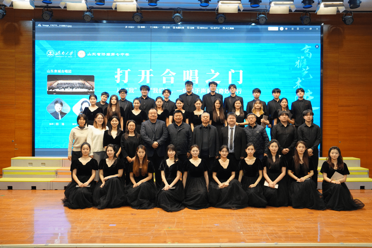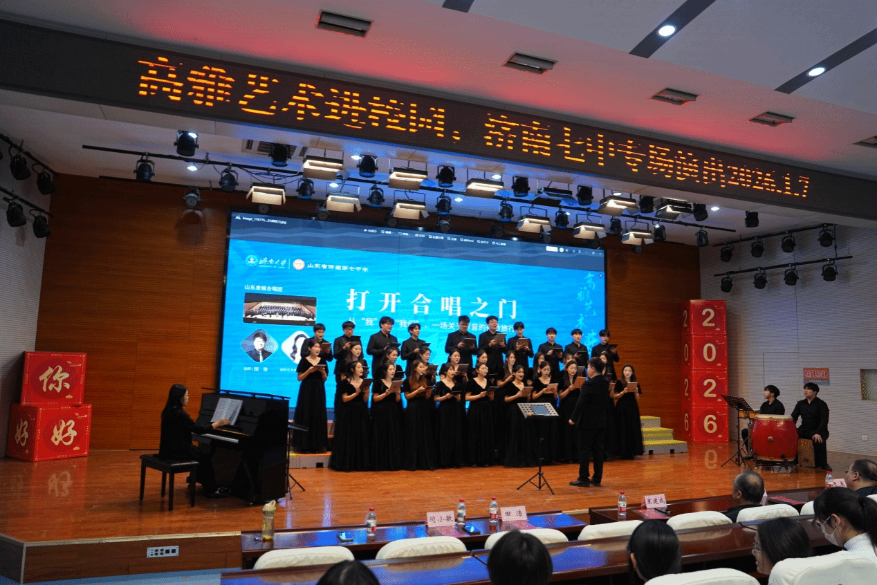 近日,“高雅艺术进校园”的合唱展演在济南七中举行。田浩副教授携济南大学音乐学院泉城合唱团献演十余首曲目,为七中学子带来了一场沉浸式的美育盛宴,演出由闵小敏老师担任钢琴艺术指导,音乐学院副院长王建成教授一同参加活动。