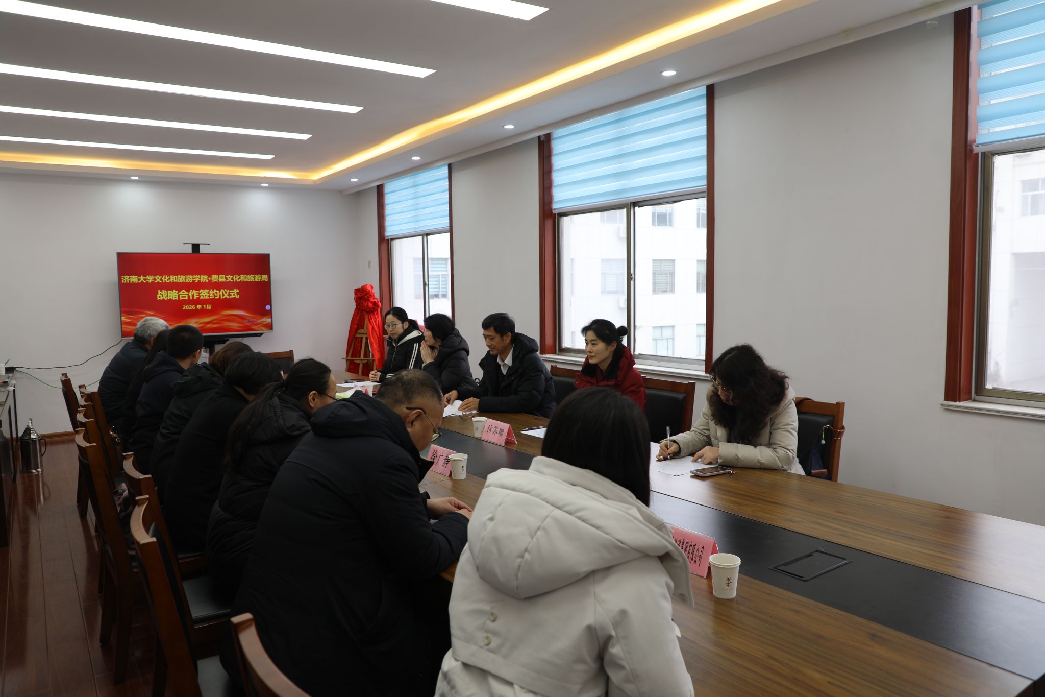 1月26日,孟德洋一行在东蒙镇与费县文化和旅游局举行了座谈交流活动。孟德洋介绍了学院的专业特色、学科优势、人才培养模式和毕业生情况。他强调学院紧密围绕国家文化强国战略和旅游业高质量发展需求,致力于培养具有国际视野、创新精神、实践能力的高素质复合型文旅人才。未来,希望在共建实习基地、开展项目合作、共享专家资源方面开展深入合作。费县文旅局局长尹娜详细介绍了费县文旅产业发展现状及人才需求缺口,特别是在文旅融合、智慧旅游、非遗传承等领域急需专业化人才。她高度评价了学院的专业实力,希望借助高校的智力资源和人才优势,为费县文旅产业注入新活力,共同打造校地合作典范。双方就共建实习实践基地、县域文旅品牌提升、乡村旅游人才培训、文旅项目策划等方面达成了初步合作意向。
