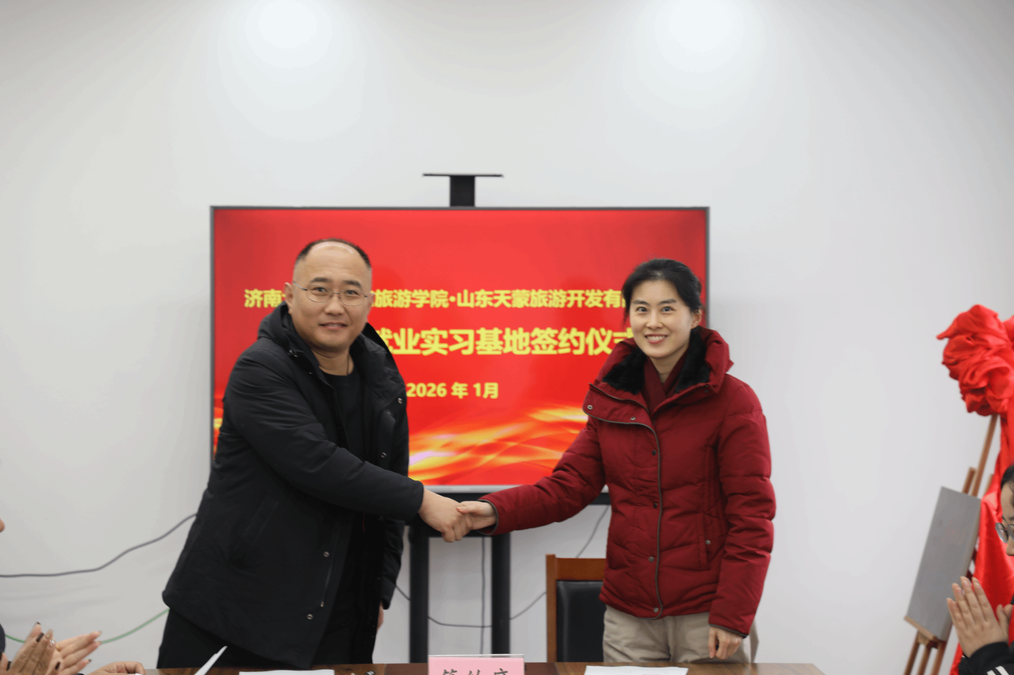 随后,孟德洋与山东天蒙旅游开发有限公司、山东沂蒙原乡文化旅游发展集团、山东合广旅游集团有限公司、山东利山涧农业科技开发有限公司四家公司负责人共同为《济南大学就业实习基地》揭牌;信苏珊、学院教授梅青、学院副教授孙淑荣与四家企业负责人签订《济南大学就业实习基地协议》。