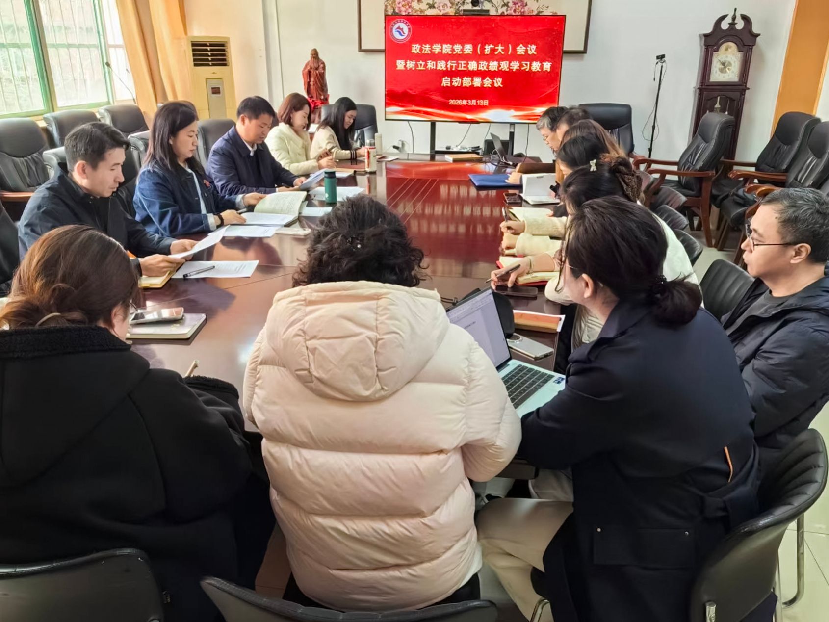 3月13日,政法学院党委召开党委(扩大)会议,传达学习学校党委关于树立和践行正确政绩观学习教育的工作要求,研究部署学院学习教育工作。学院领导班子成员、党支部书记、组织员等参加会议。会议由学院党委副书记、副院长李涛主持。