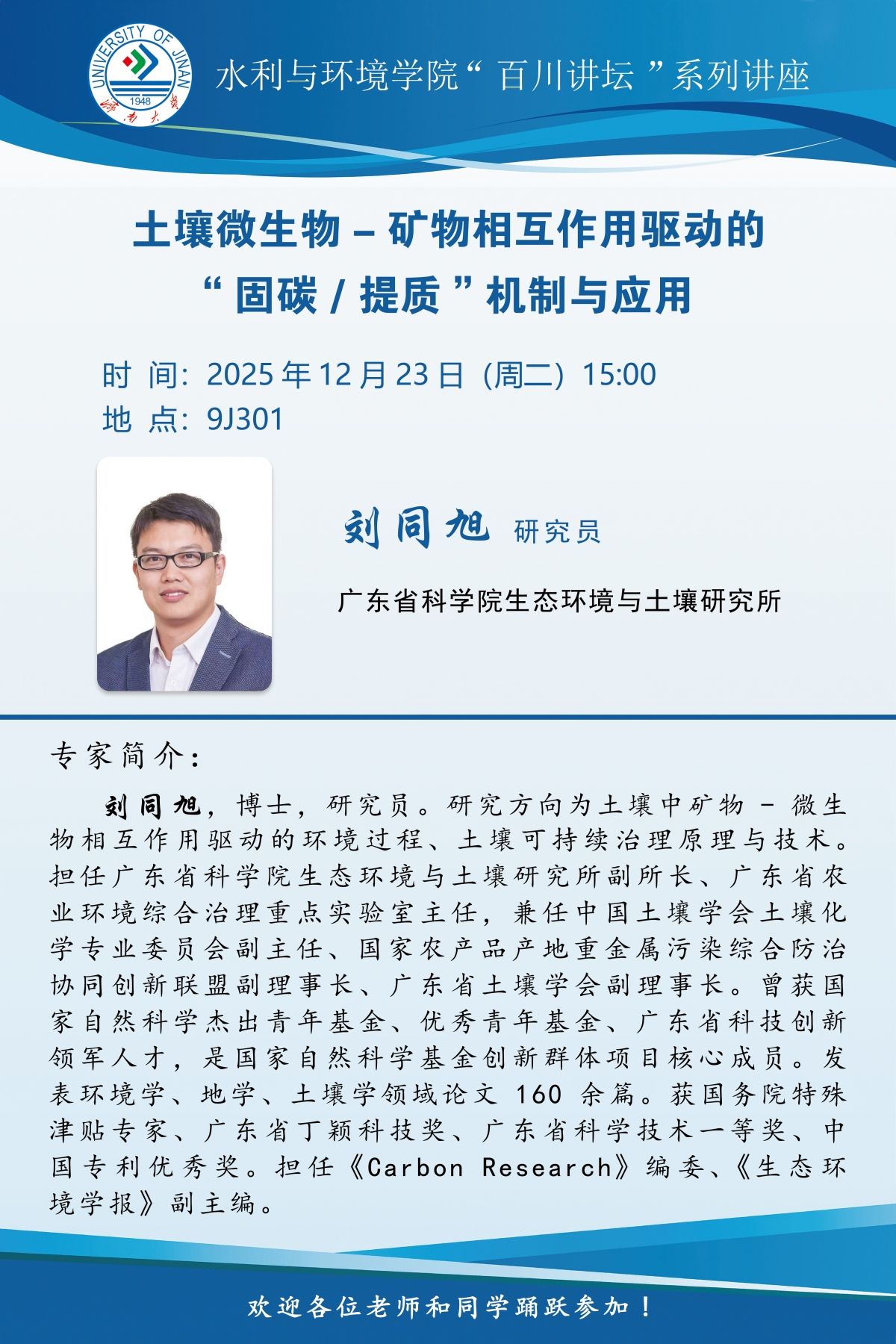 水利与环境学院“百川讲坛”系列讲座:土壤微生物-矿物相互作用驱动的“固碳/提质”机制与应用