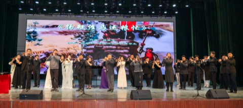 在中国竹笛经典作品展示环节,来自山东艺术学院与济南大学的竹笛专业学生联袂献艺,以多元曲目呈现竹笛艺术的丰富面貌。开场笛子重奏《山东秧歌》热烈明快,勾勒出齐鲁民间音乐的浓郁风情;《春风夜雨情》《祁连音画·舞沙》与《挂红灯》在抒情与技巧之间收放自如,展现了竹笛音色的细腻层次;郝益军教授创作的《泉》以清澈灵动的音乐意象引发共鸣,彰显作品的审美格调与地域文化气息;《万年红》在笙与梆子伴奏的烘托下更显质朴热烈;《热情与冷漠的邂逅》、重奏《乡念》及《山村迎亲人》分别从现代语汇、群像表达与民间叙事角度拓展了竹笛的舞台表现力;《夸山东》《三五七》与《向往》进一步呈现了传统曲牌与当代创作的互文关系。最后,郝益军教授及在场的竹笛专业师生齐奏《扬鞭催马运粮忙》将活动推向高潮,铿锵昂扬的旋律引发现场同学们的共鸣,现场反响热烈。