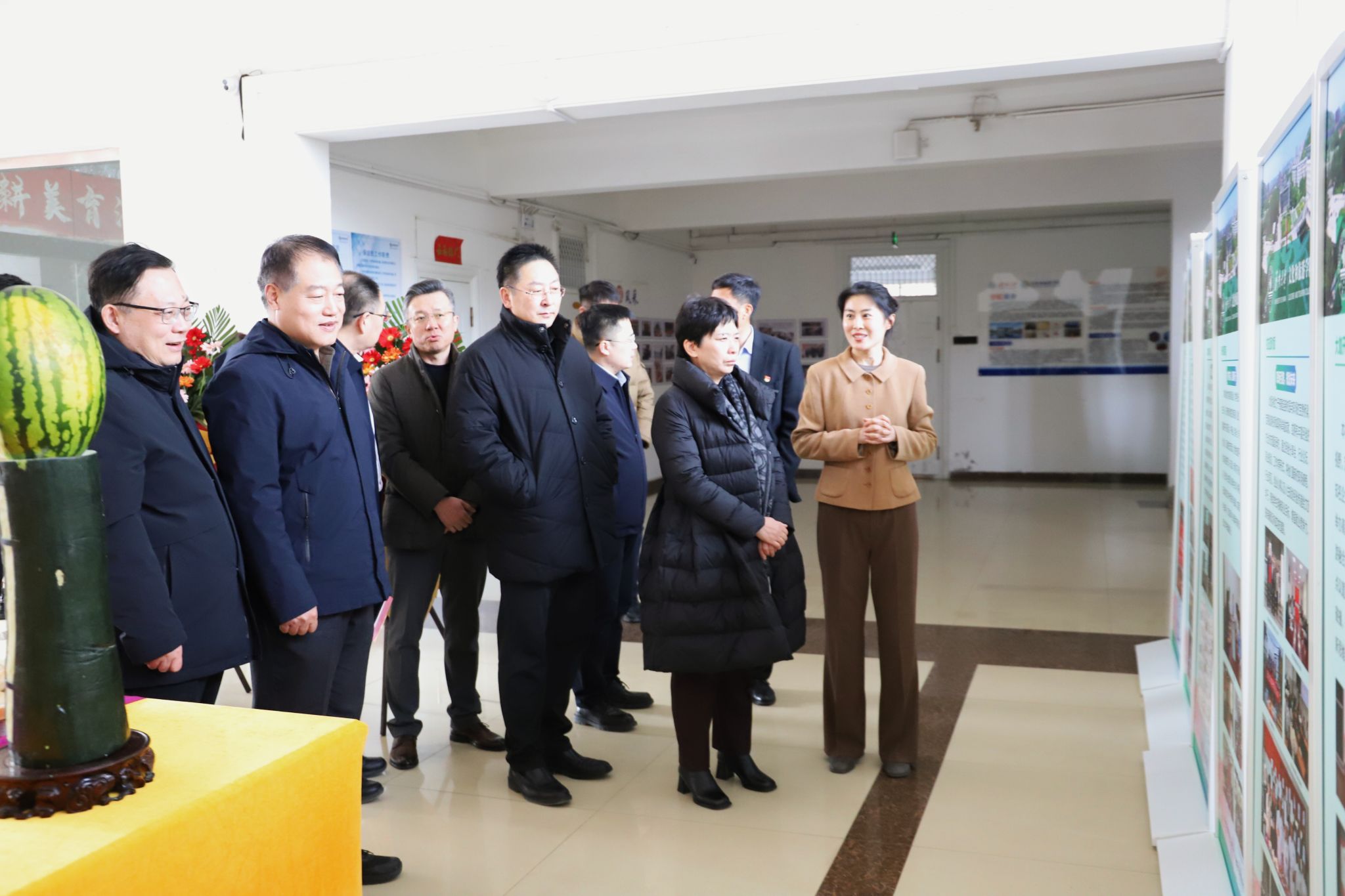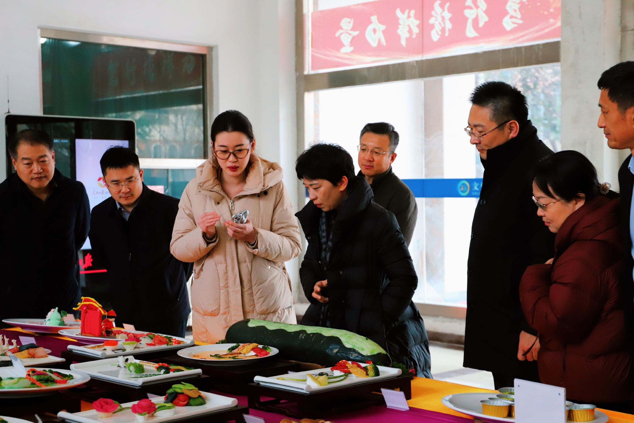 表彰仪式结束后,与会领导、师生移步展厅,共同参观了精彩纷呈的学院美育成果展。展览涵盖了食材雕刻、冷拼盘、中式面点、西式面点等四大板块。栩栩如生的雕刻作品、精巧别致的面点造型、色彩和谐富有创意的冷拼盘。每一件作品都凝聚着师生的智慧与汗水,是对“崇尚美、追求美、创造美”精神风貌的生动诠释。参观过程中,领导们频频驻足,仔细观看,并与现场师生亲切交流,对同学们将美学理念融入专业实践的能力给予高度赞赏。